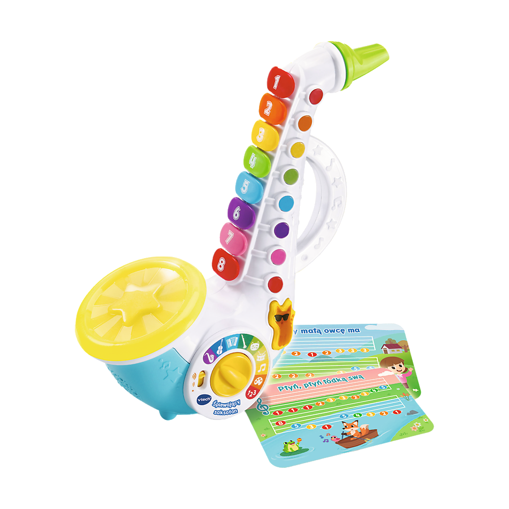 Ze Śpiewającym saksofonem Twoje dziecko pozna świat muzyki, instrumentów, liczb oraz kolorów – a wszystko to w rytmie wesołego jazzu. Dwie karty z nutami pomogą stawiać pierwsze kroki w roli muzyka, a poręczny uchwyt pozwoli zabrać saksofon w dowolne miejsce.