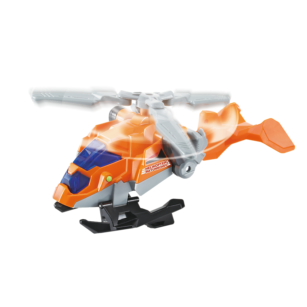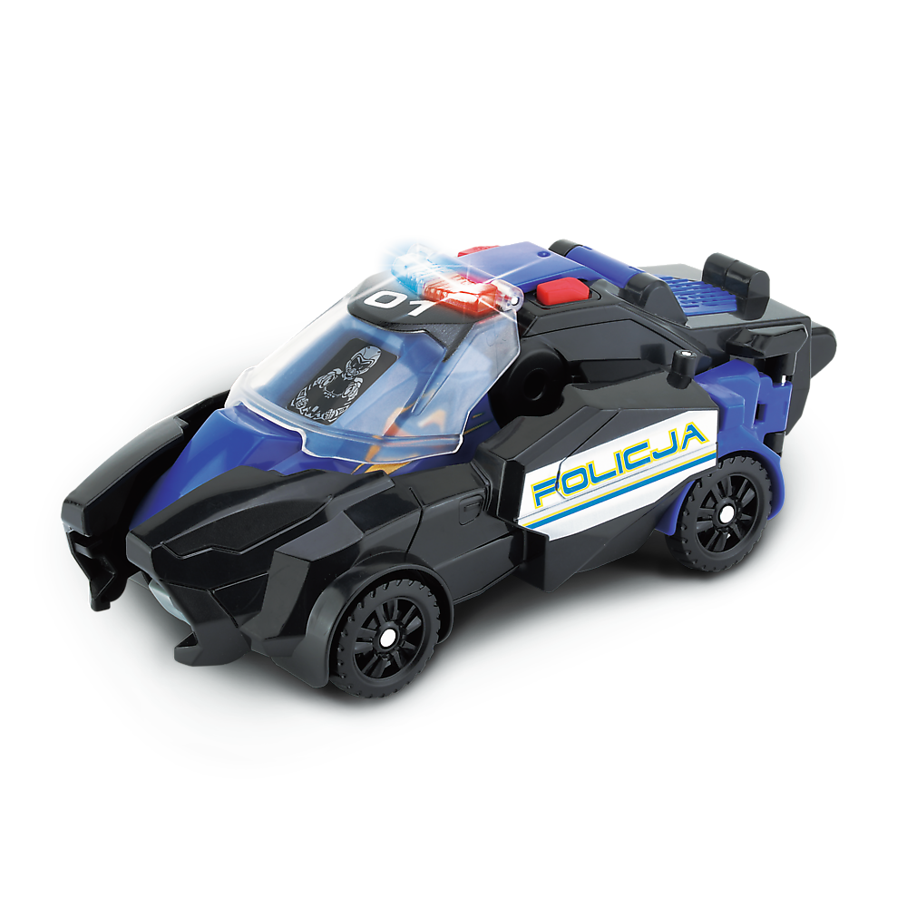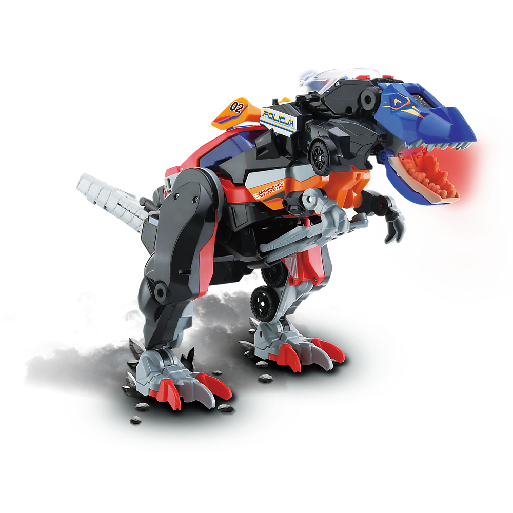 Gotowy do akcji ratunkowej? Połącz trzy pojazdy ratunkowe – wóz strażacki, helikopter ratunkowy i policyjny radiowóz – i przekształć je w groźnego T-Rexa o długości ponad 50 cm! Radiowóz policyjny wyposażony jest w światła, dźwięki i animowany ekran LCD. Wóz strażacki ma obrotową i wysuwaną drabinę, a helikopter – kręcące się śmigło. Specjalne przyciski aktywują dźwięki i wypowiedzi pasujące do trybu dinozaura lub pojazdu.